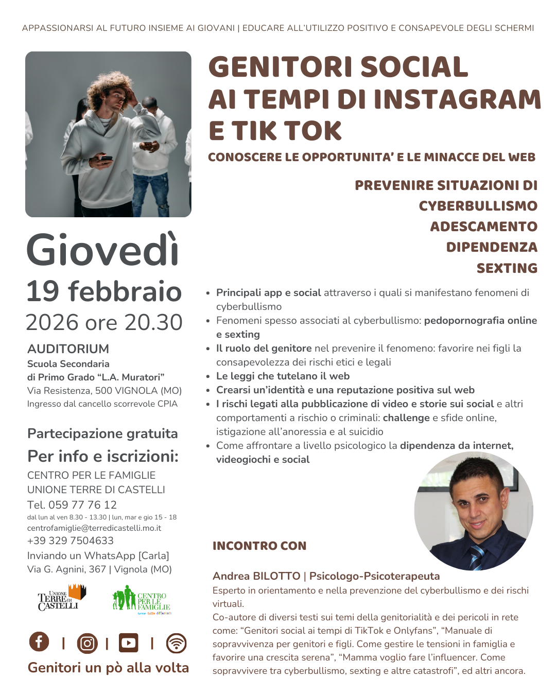 Ne parleremo insieme a Andrea Bilotto, psicologo, psicoterapeuta, esperto in orientamento e nella prevenzione del cyberbullismo e dei rischi virtuali.