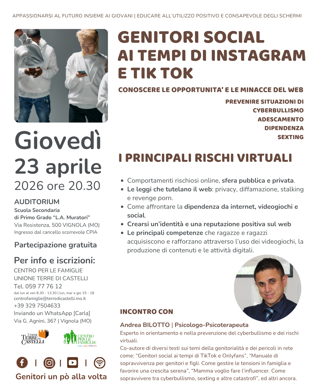 GENITORI SOCIAL AI TEMPI INSTAGRAM E TIK TOK 23/04/2026 ore 20.30 Auditorium Scuole Medie Vignola